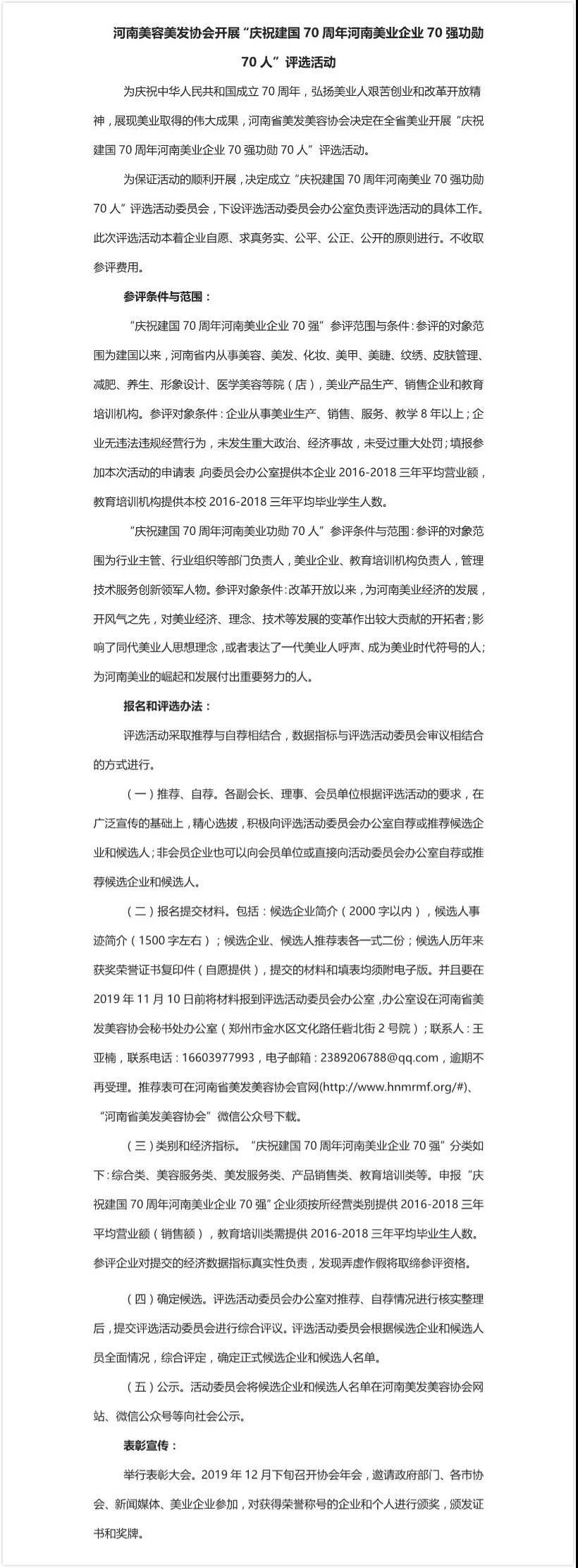 關于河南美容美發(fā)協會開展“慶祝建國70周年河南美業(yè)企業(yè)70強功勛70人”評選活動的通知